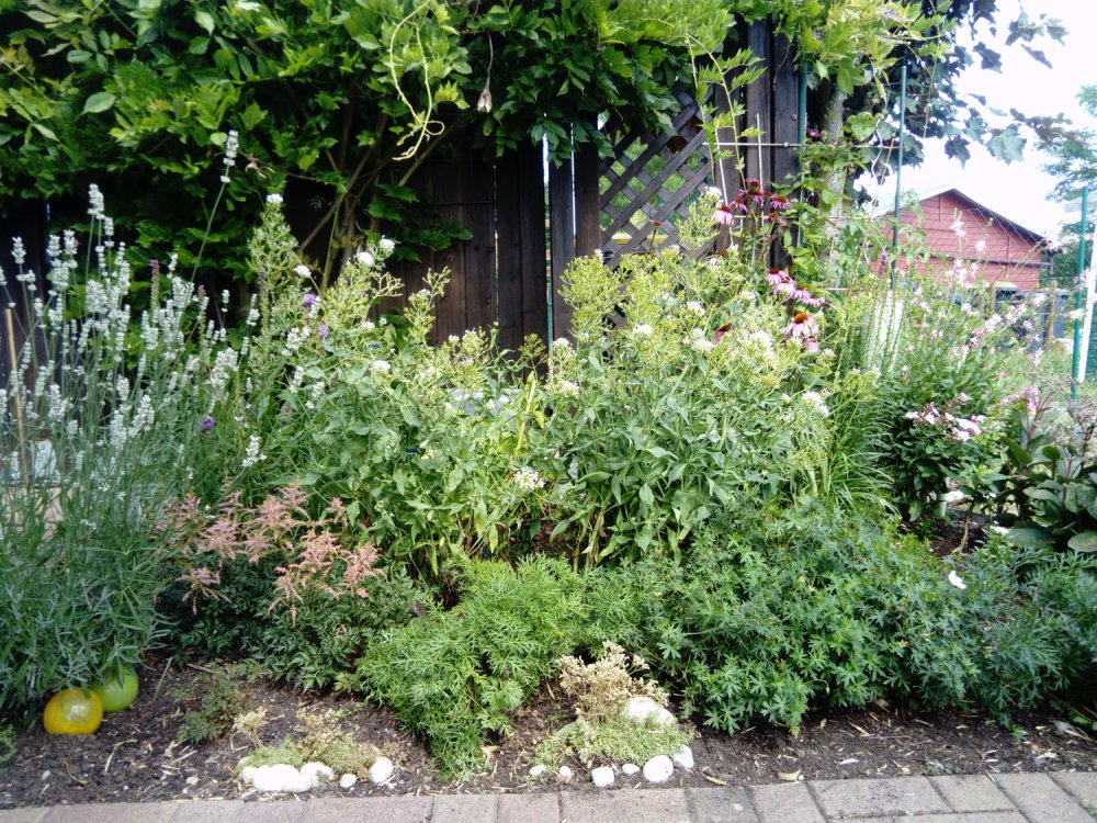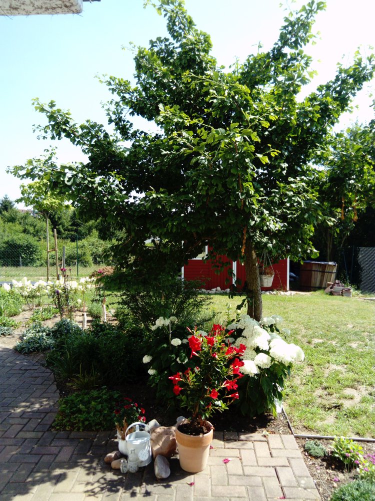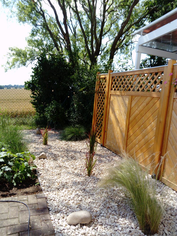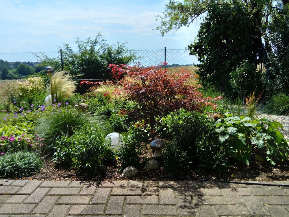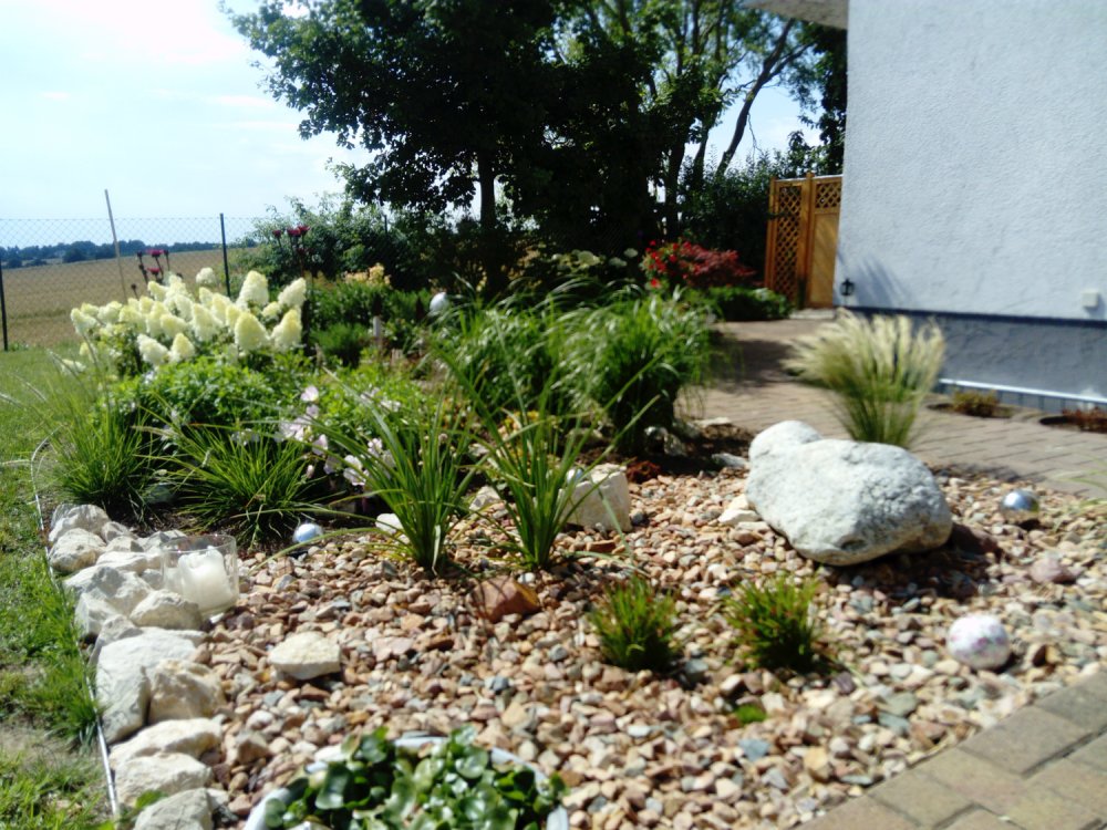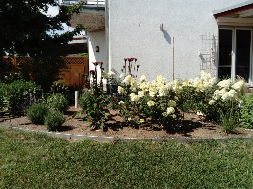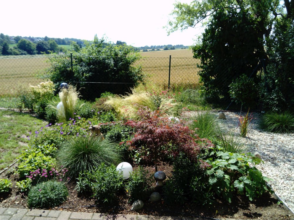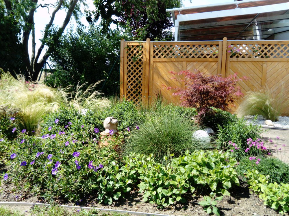 Hier blüht Ihnen etwas zu jeder Jahreszeit. Mit viel Liebe zum Detail wurden hier die Kübelbepflanzung auf der Terrasse mit in die Gesamtplanung integriert. Ein Naturquellstein in Sitzplatznähe sorgt für Ruhe und Geborgenheit.