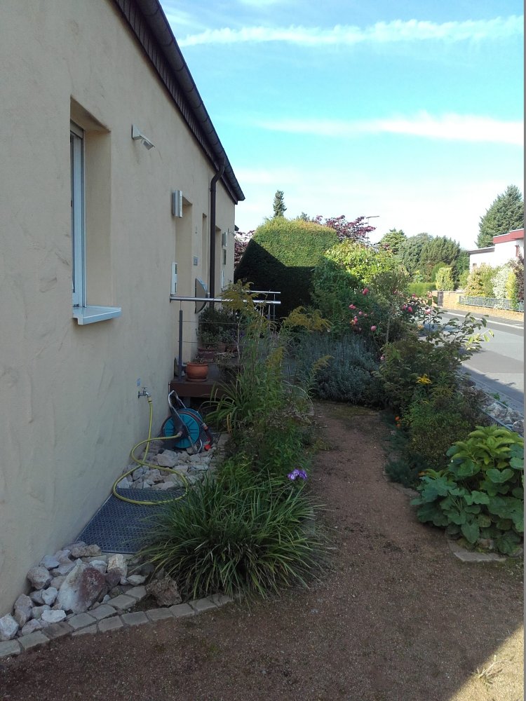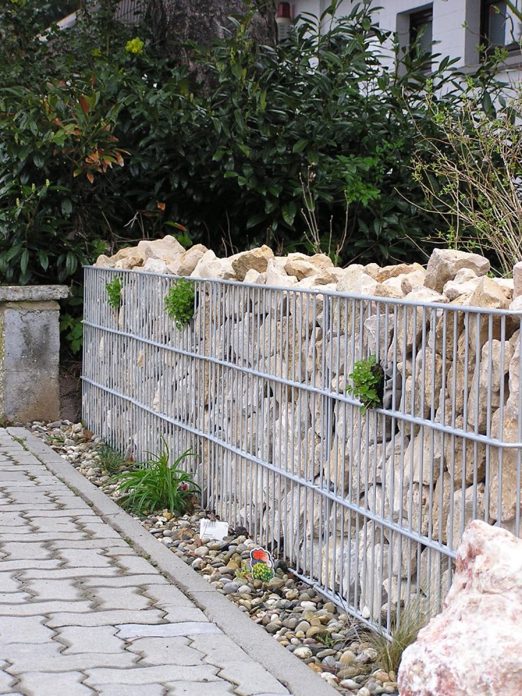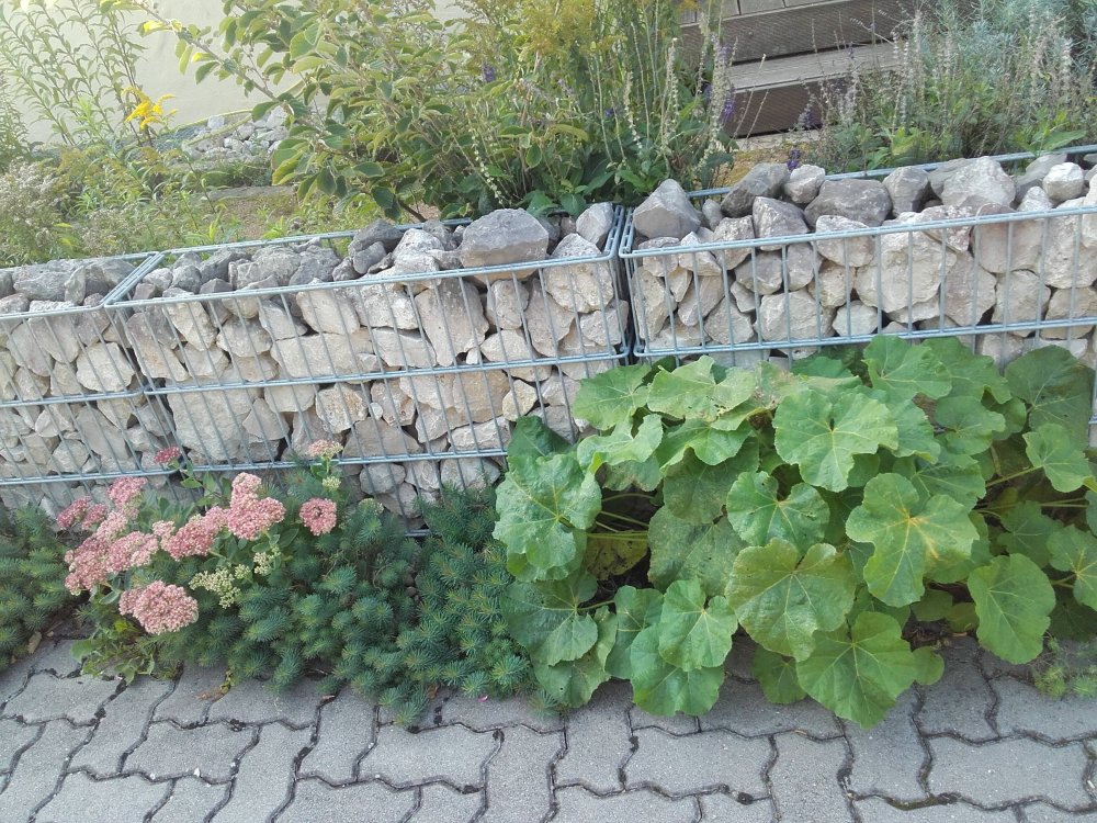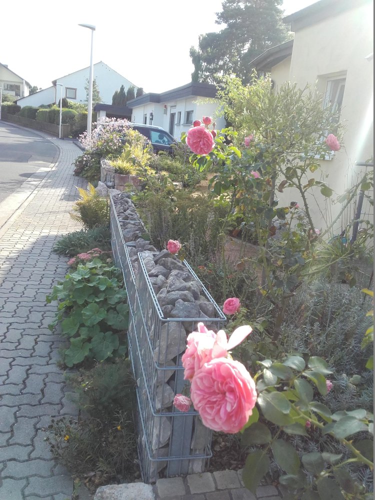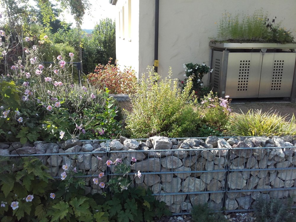 Wer möchte im Vorgarten schon auf Mülltonnen schauen? In diesem Garten sind lästige Entsorgungsbehältnisse kein Thema mehr. Frisch begrünte Mauergabionen fassen die schön geschwungenen Bessunger Kieswege ein und eine mediterrane Bepflanzung rundet den positiven Gesamteindruck ab.